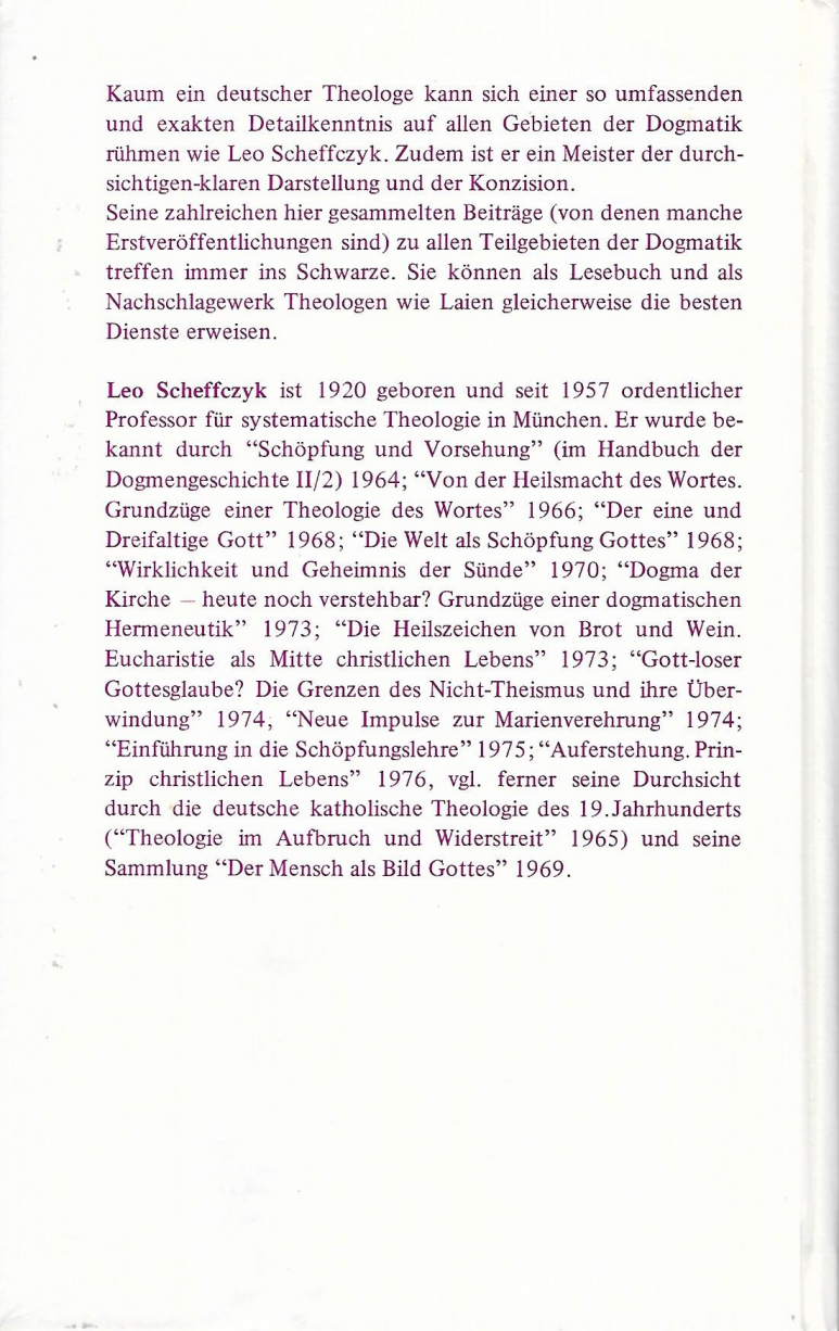 Leo Kardinal Scheffczyk, geb. 1920 und am 8. Dezember 2005 gestorben, war u. a. seit 1957 ordentlicher Professor für systematische Theologie in München und hat mehrere Werke über die Schöpfung verfasst, aber auch solche über Trinität, Christologie ("Auferstehung"), Eucharistie, Sünde und vieles andere.