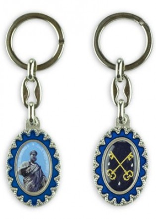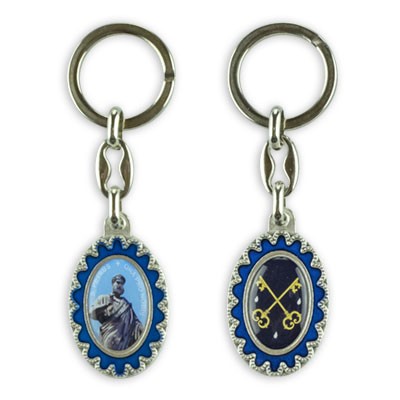 incl. MwSt.Der Schlüsselanhänger hat eine Gesamtlänge von ca. 10 cm. Das Medaillon ist 27 mm breit und 38 mm hoch. Auf der Vorderseite des Anhängers ist ein Sticker der Petrusstatue vom Petersplatz in Rom eingelassen, die den Schriftzug „S. Petrus + ora pro nobis“ trägt (siehe Abb. links). Die Rückseite des Medaillons zeigt das offzielle Wappen der Priesterbruderschaft St. Petrus (siehe Abb. rechts)