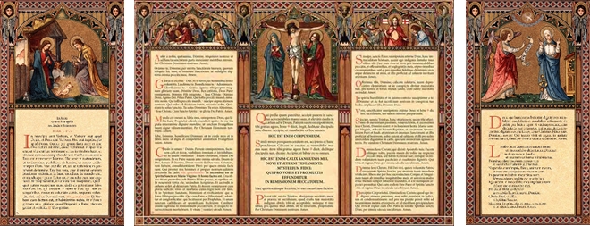 Alle Texte sind übersichtlich gesetzt und sowohl mit Betonungsakzenten als auch mit Hinweiszeichen für Verneigungen und Bekreuzigungen versehen, was die korrekte lateinische Aussprache sehr erleichtert und sie auch für Anfänger in der Kunst der Zelebration des Außerordentlichen Ritus sehr komfortabel macht. Die mittlere Tafel enthält in ihrer linken Spalte aus den Gebeten der Vormesse das Aufer a nobis, das Orámus te, das Glória, das Munda cor mit dem Jube Dómine und schließlich das Credo. Ihre rechte Spalte enthält die Opferungsgebete und die Kommuniongebete des Priesters. Auf dem mittleren Abschnitt ist als zentraler Teil die heilige Wandlung in etwas größerer Schrift gesetzt. Darunter befindet sich das Pláceat tibi, welches der Priester über den Altar gebeugt vor dem Schlusssegen verrichtet.