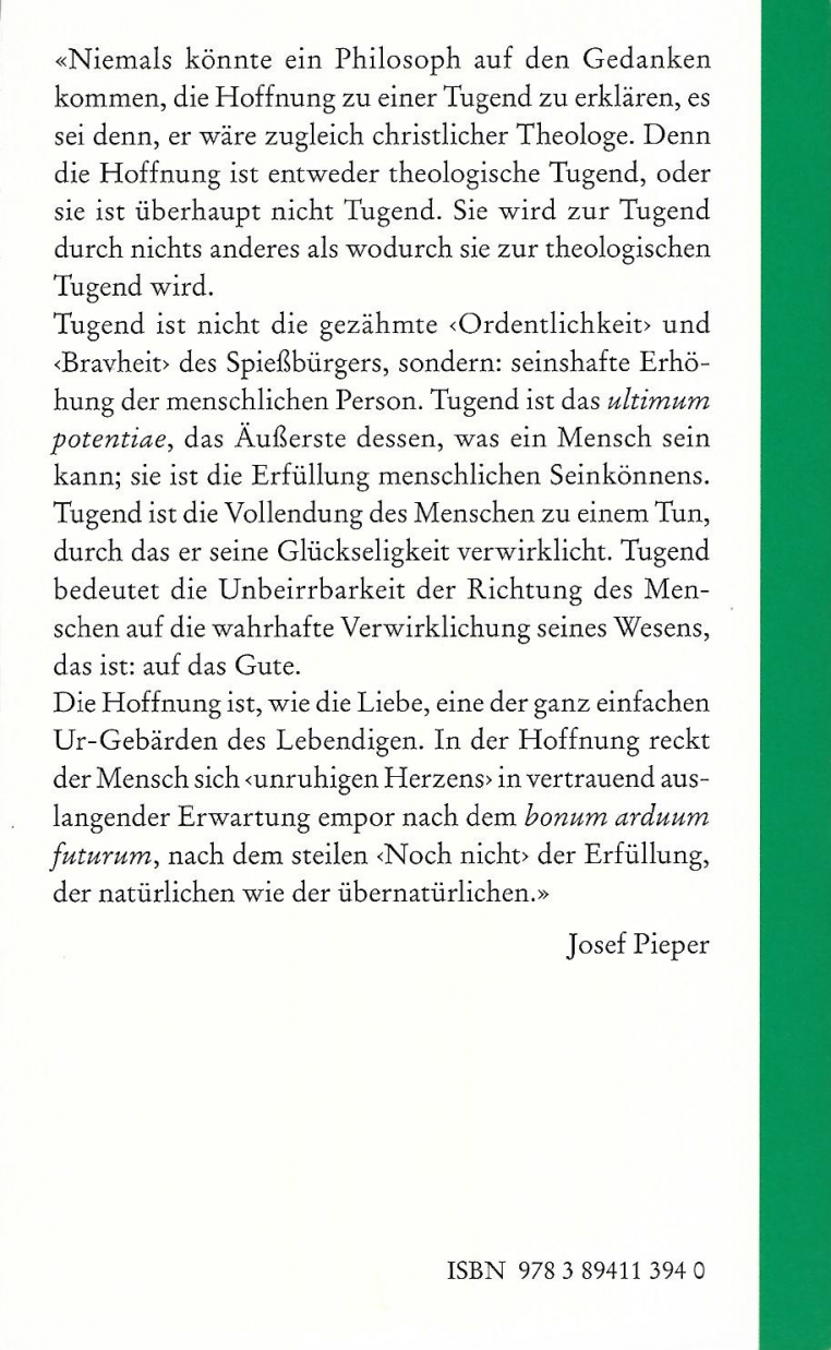 "Niemals könnte ein Philosoph auf den Gedanken kommen, die Hoffnung zu einer Tugend zu erklären, es sei denn, er wäre zugleich christlicher Theologe. Denn die Hoffnung ist entweder theologische Tugend, oder sie ist überhaupt nicht Tugend. Sie wird zur Tugend durch nichts anderes als wodurch sie zur theologischen Tugend wird.