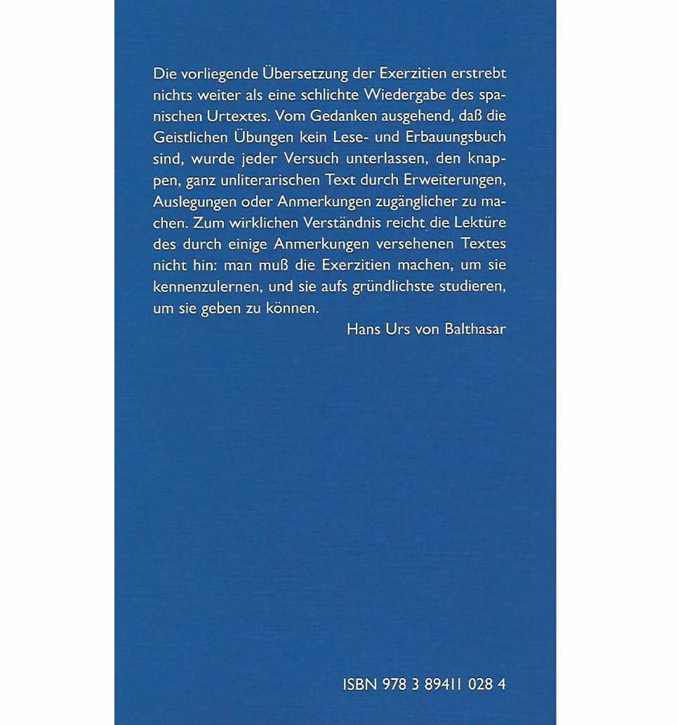 Die vorliegende Übersetzung der Exerzitien, so schreibt Hans Urs von Balthasar, erstrebt nichts weiter als eine schlichte Wiedergabe des spanischen Urtextes. Vom Gedanken ausgehend, dass die geistlichen Übungen kein Lese- und Erbauungsbuch sind, wurde jeder Versuch unterlassen, den knappen, ganz unliterarischen Text durch Erweiterungen, Auslegungen oder Anmerkungen zugänglicher zu machen. Zum wirklichen Verständnis reicht die Lektüre des durch einige Anmerkungen versehenen Textes nicht hin: man muss die Exerzitien machen, um sie kennenzulernen, und sie aufs gründlichste studieren, um sie geben zu können.