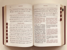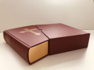 Das Buch umfasst 1.264 Seiten und ist auf robustes 70g-Papier mit einem Seitenformat von 19 x 26, 6 cm cm gedruckt. Die Blockstärke beträgt etwa 6 cm und die farbig auf das Kanonbild abgestimmten Lesebänder sind am unteren Rand von Hand genäht, was eine gute Haltbarkeit verspricht. Der in ahornrotes Rindspaltleder gebundene und mit Goldprägungen verzierte Umschlag ist von edlem Aussehen.